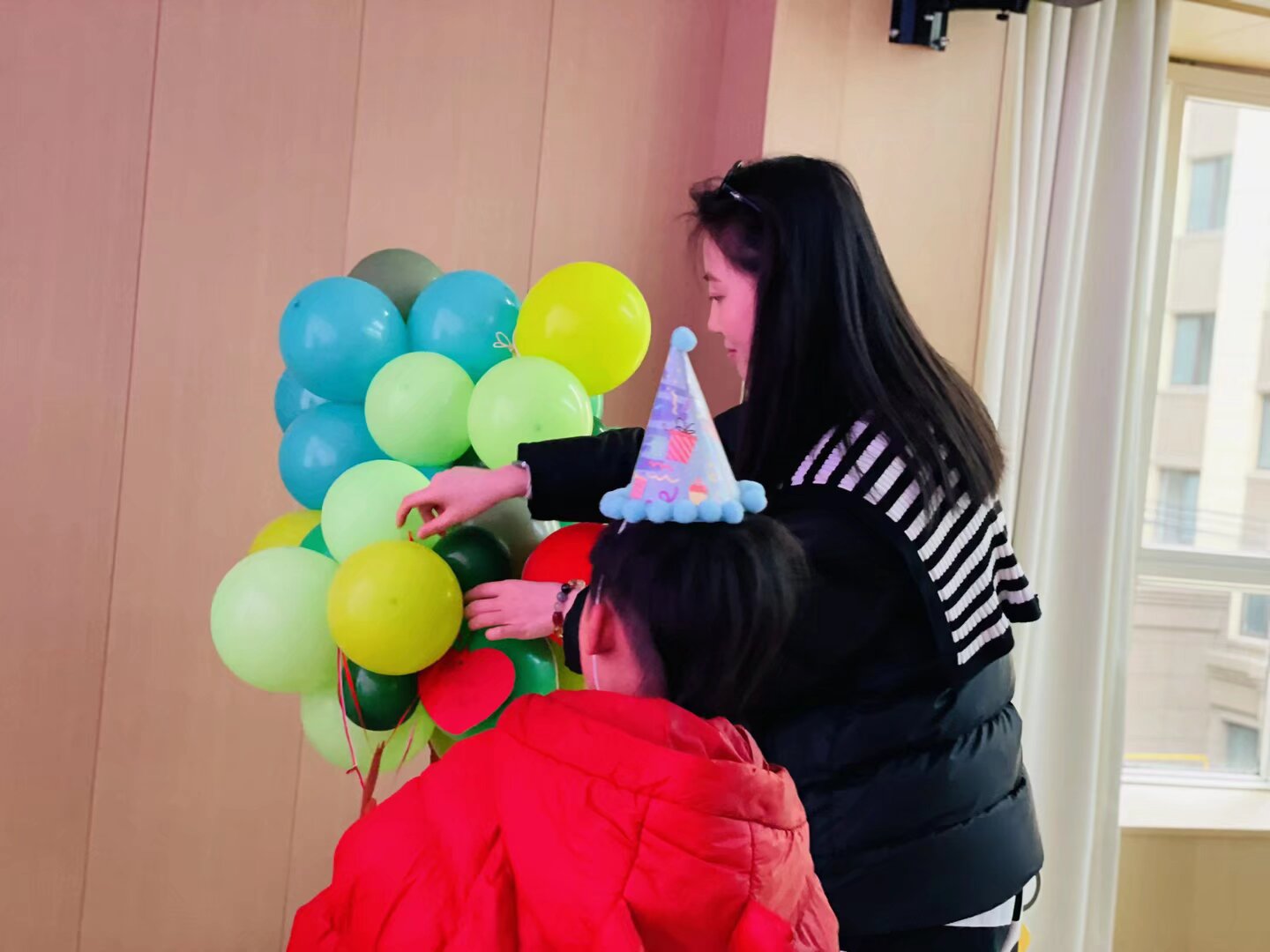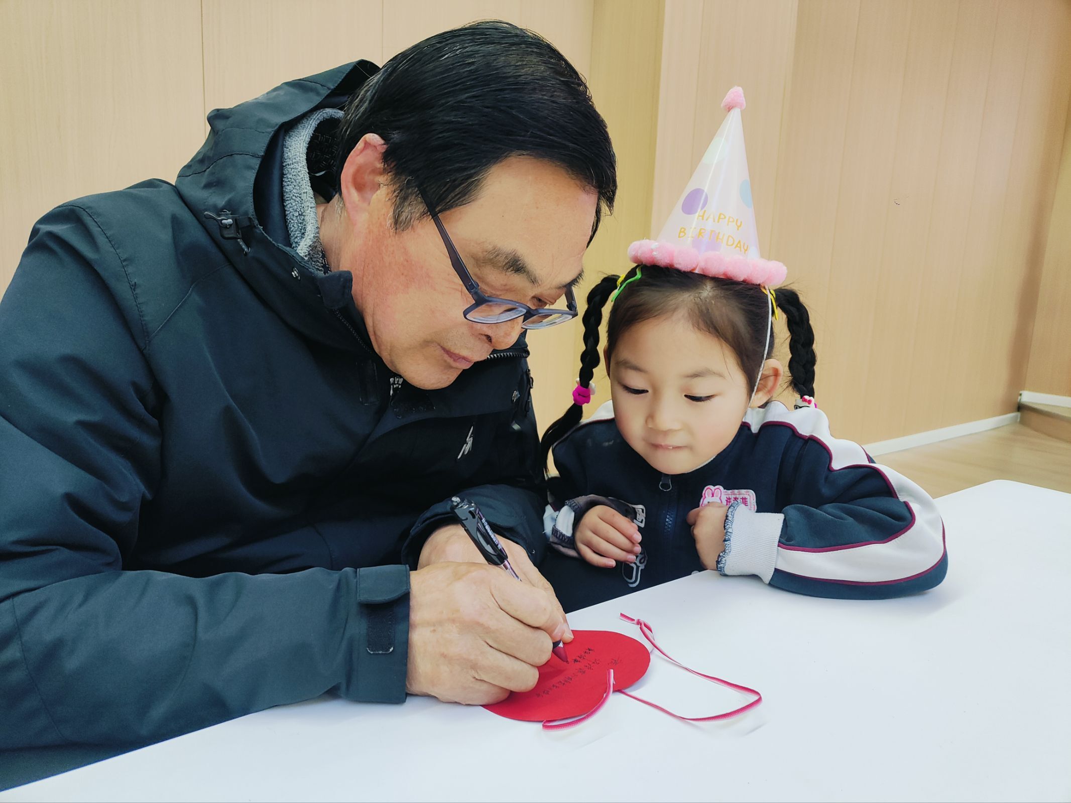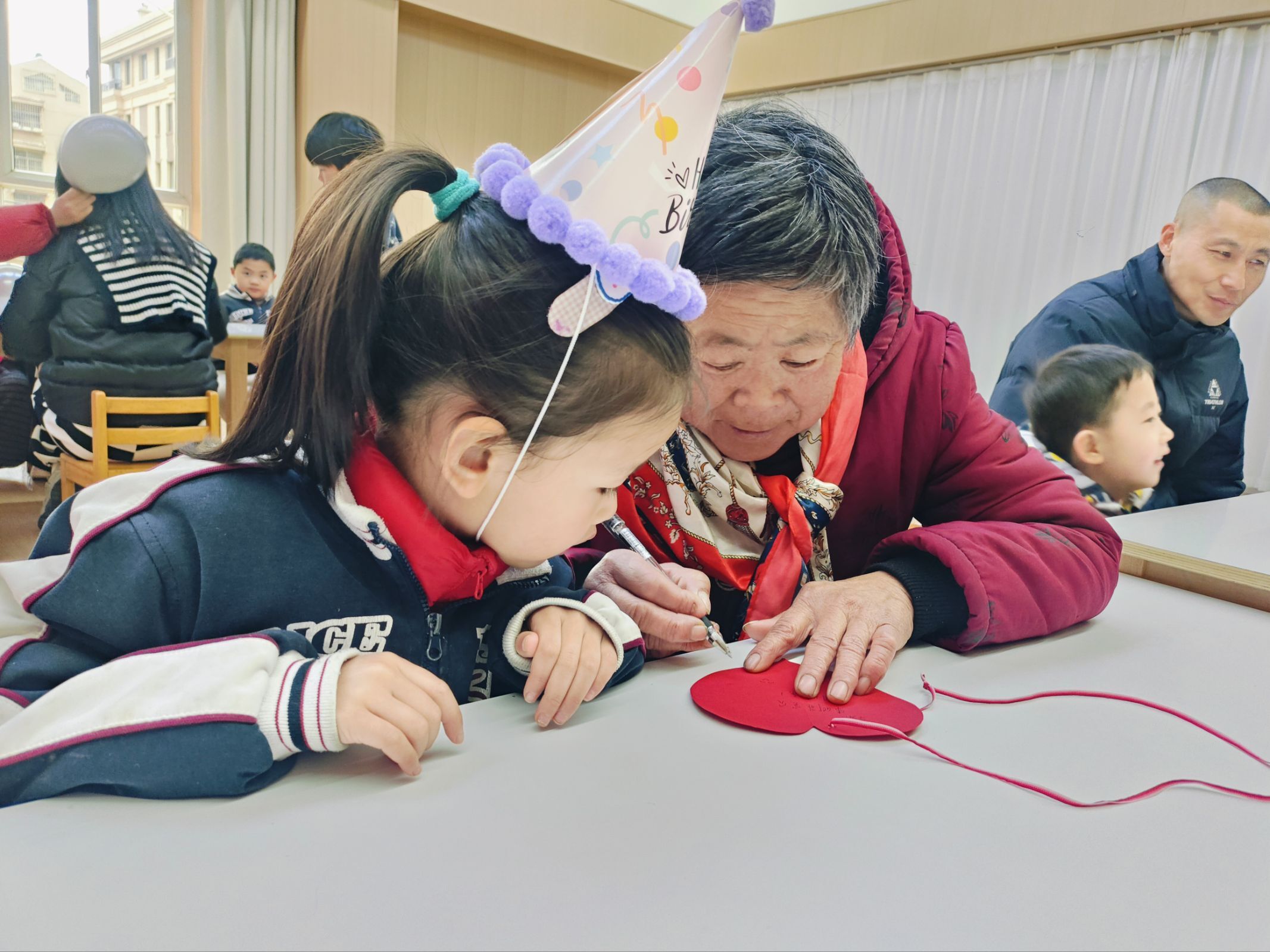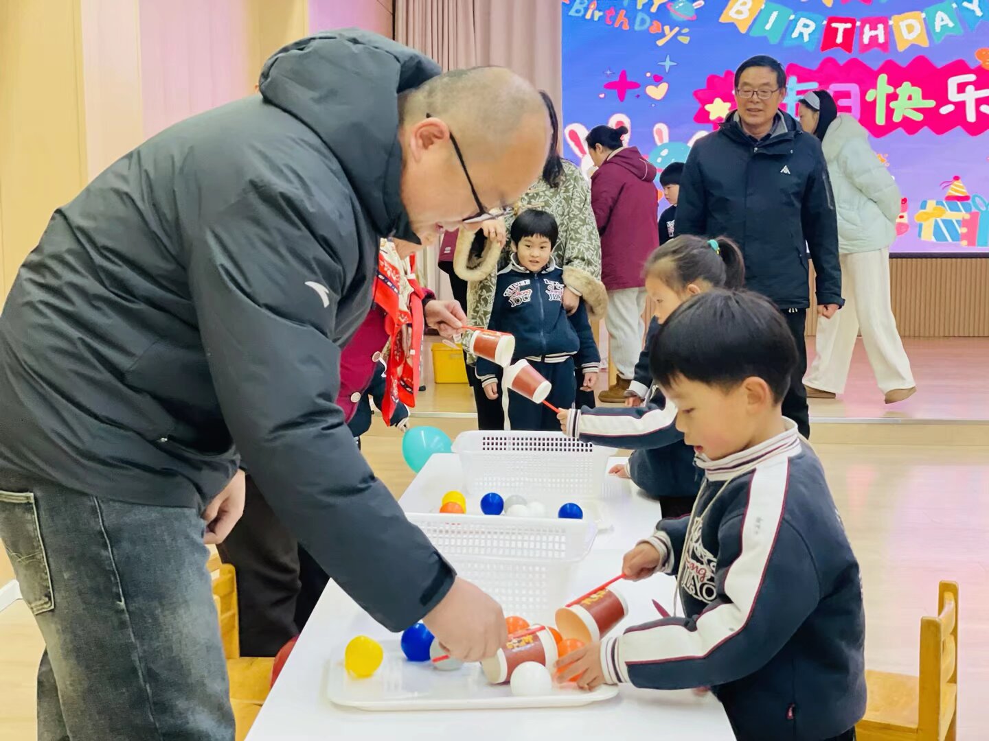 宝贝站在舞台中央,举着麦克风勇敢说出心愿,身后是闪烁着“生日快乐”的绚烂屏幕,每一颗星星都映着成长的喜悦。手工桌上,奶奶握着孙女的小手,在红色心形卡纸上一笔一划写下祝福,毛线穿过孔洞的瞬间,爱也跟着被牢牢系住。游戏区里,妈妈和孩子合作完成“彩虹运球”,彩色小球在托盘里滚动,像极了亲子间默契的节拍。