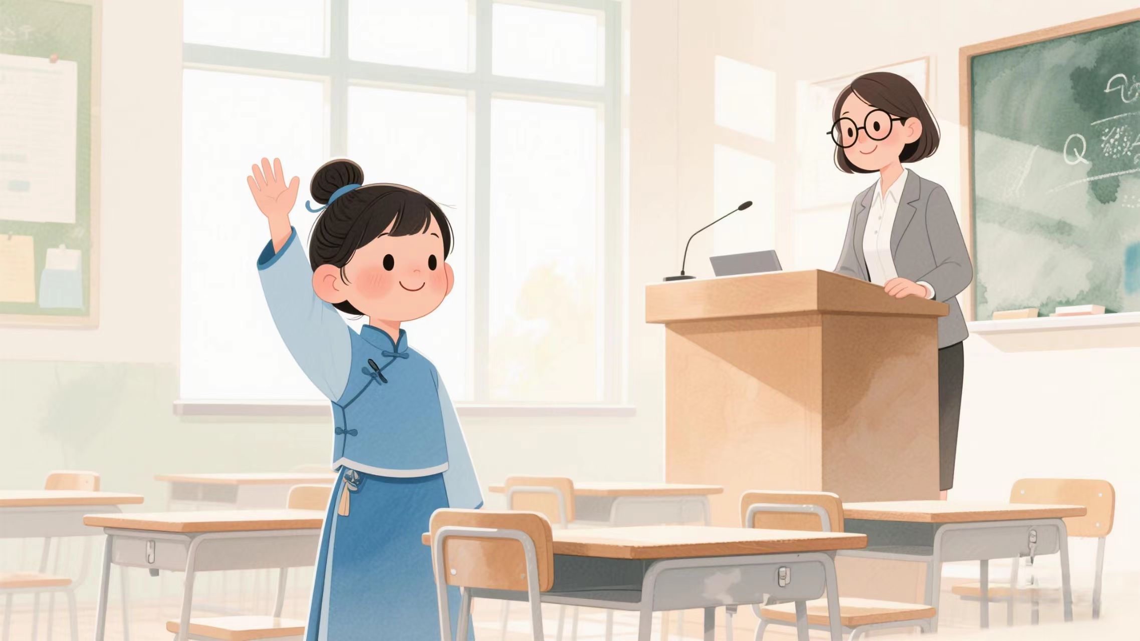 课堂上老师提问,小宇举手站立回答,声音洪亮又清晰。“这个问题我来回答!”说完还向老师微微点头。《弟子规》讲“凡道字,重且舒,勿急疾,勿模糊”,回答问题时口齿清晰、态度恭敬,才是尊重师长的表现。
