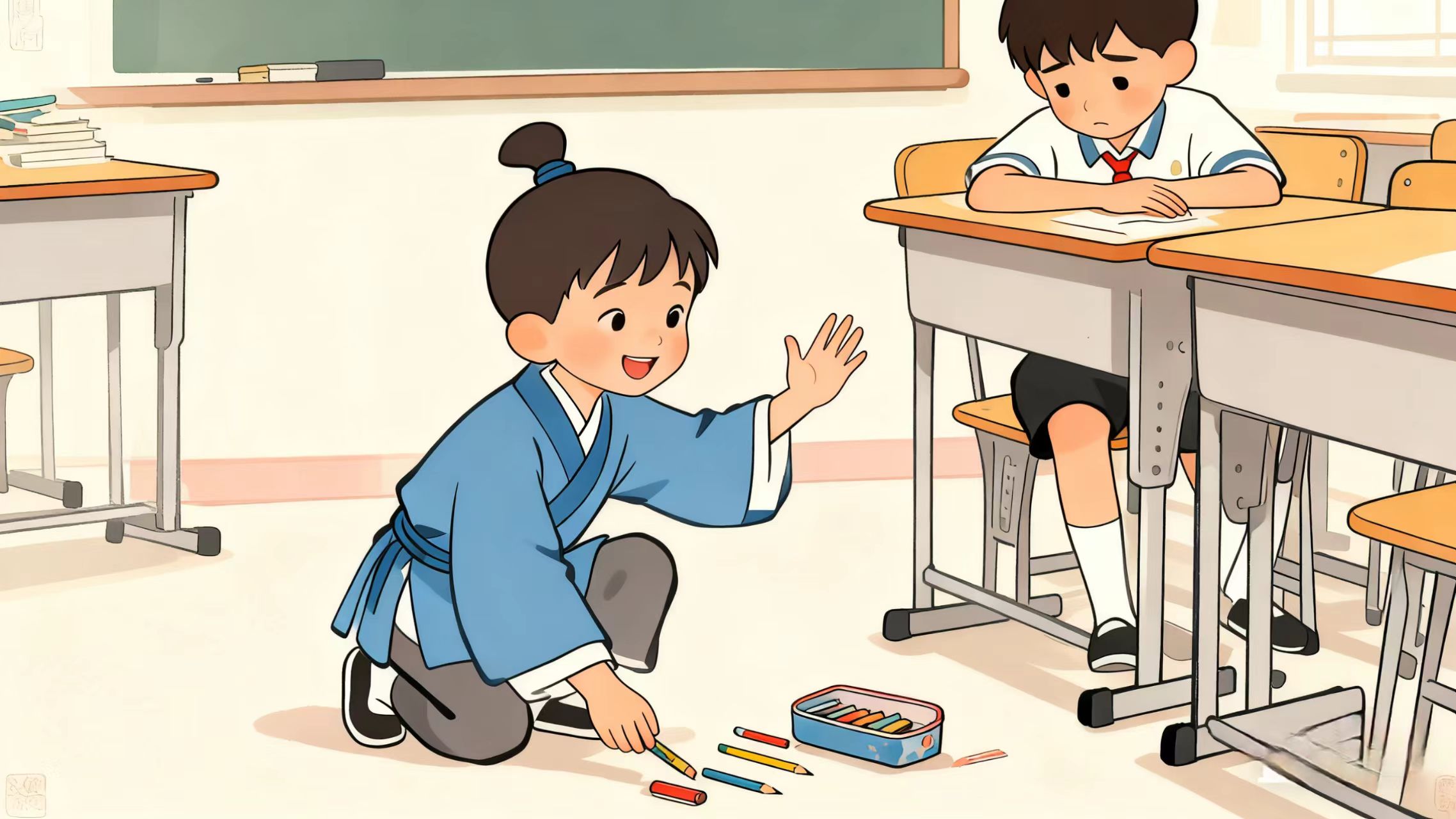 同桌不小心碰掉他的铅笔盒,小宇笑着摆手:“没关系,我自己捡就好。”两人一起蹲下身,很快收拾好散落的文具。《弟子规》言“言语忍,忿自泯”,同学间互相包容,小矛盾也能变成友谊的粘合剂。