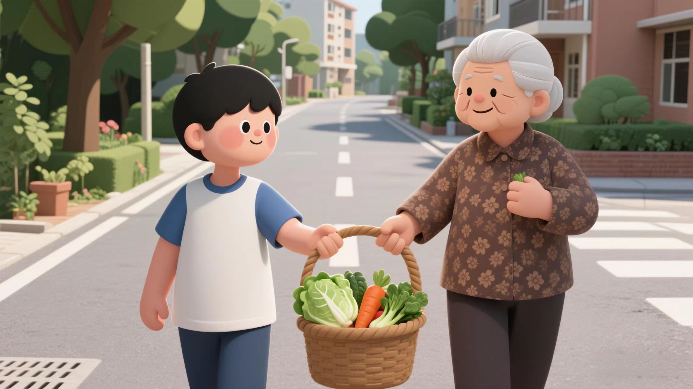 放学回家看到邻居奶奶提着重菜篮,小宇快步上前:“奶奶我帮您!”一路帮奶奶拎菜送到家,奶奶直夸:“这孩子真懂礼貌!”《弟子规》教我们“事诸父,如事父;事诸兄,如事兄”,对待长辈要像对待自己父母一样恭敬,主动帮忙是美德。