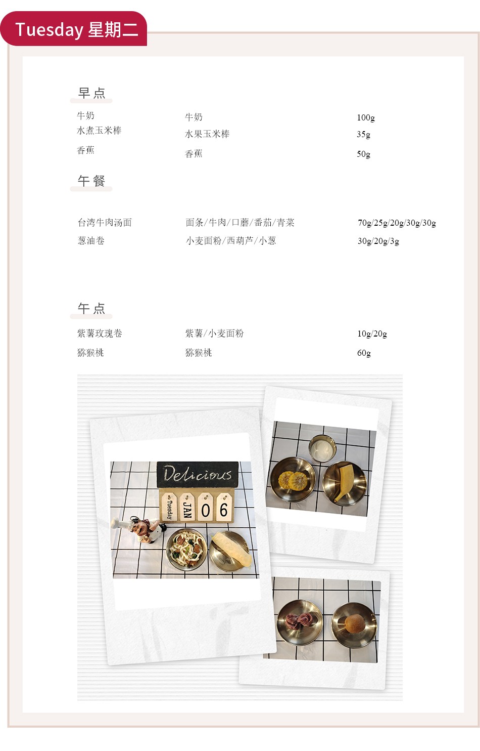 本周膳食注重营养的全面性与菜肴的亲和力。通过虾仁、牛肉、羊肉、鸡肉等多种优质蛋白的轮换供应,为幼儿活动与生长发育提供持续动力。食谱亮点巧妙融入了饮食文化,如“台湾牛肉汤面”,以其温和的汤底与丰富的搭配,提供了别具一格的味觉体验。烹饪上则继续发扬“蒸菜”的优长,“清蒸莲藕丸子”、“肉末粉丝蒸娃娃菜”等菜品,最大限度地保留了食材的天然原味与营养素,口感软糯,易于消化,特别适合幼儿娇嫩的肠胃。多样化的蔬菜与汤品,则确保了维生素、矿物质与水分的均衡补充。
