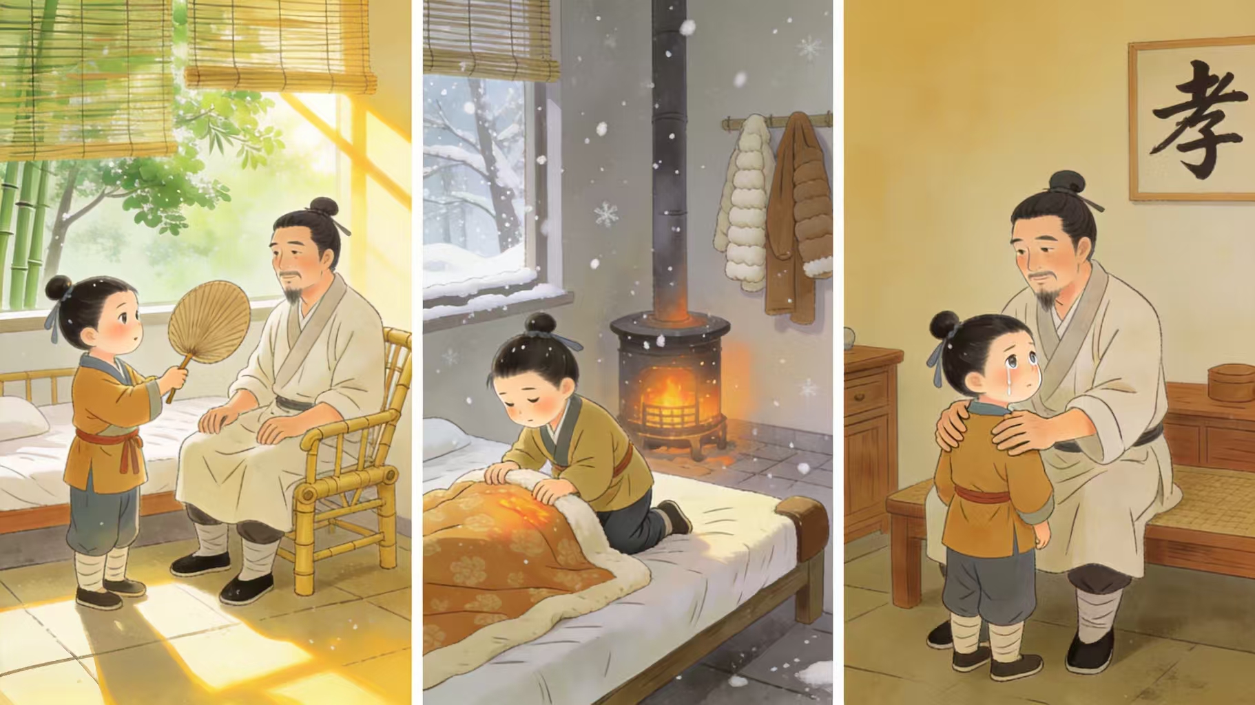 小朋友们,在《弟子规》里就有这样两句话“冬则温,夏则凊”,说的就是像黄香这样,冬天要给父母温暖,夏天要给父母清凉。黄香用自己的行动,表达了对爸爸妈妈深深的爱。