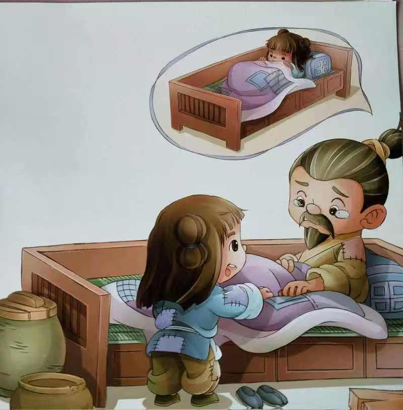 冬天到了,天气冷得刺骨。黄香想到爸爸的被窝肯定冷冰冰的,爸爸睡在里面会不舒服。于是,每天晚上睡觉前,黄香就先钻进爸爸的被窝,用自己的小身体把被窝焐得暖暖和和的,再让爸爸来睡。爸爸摸着暖烘烘的被窝,感动得眼睛都湿润了。