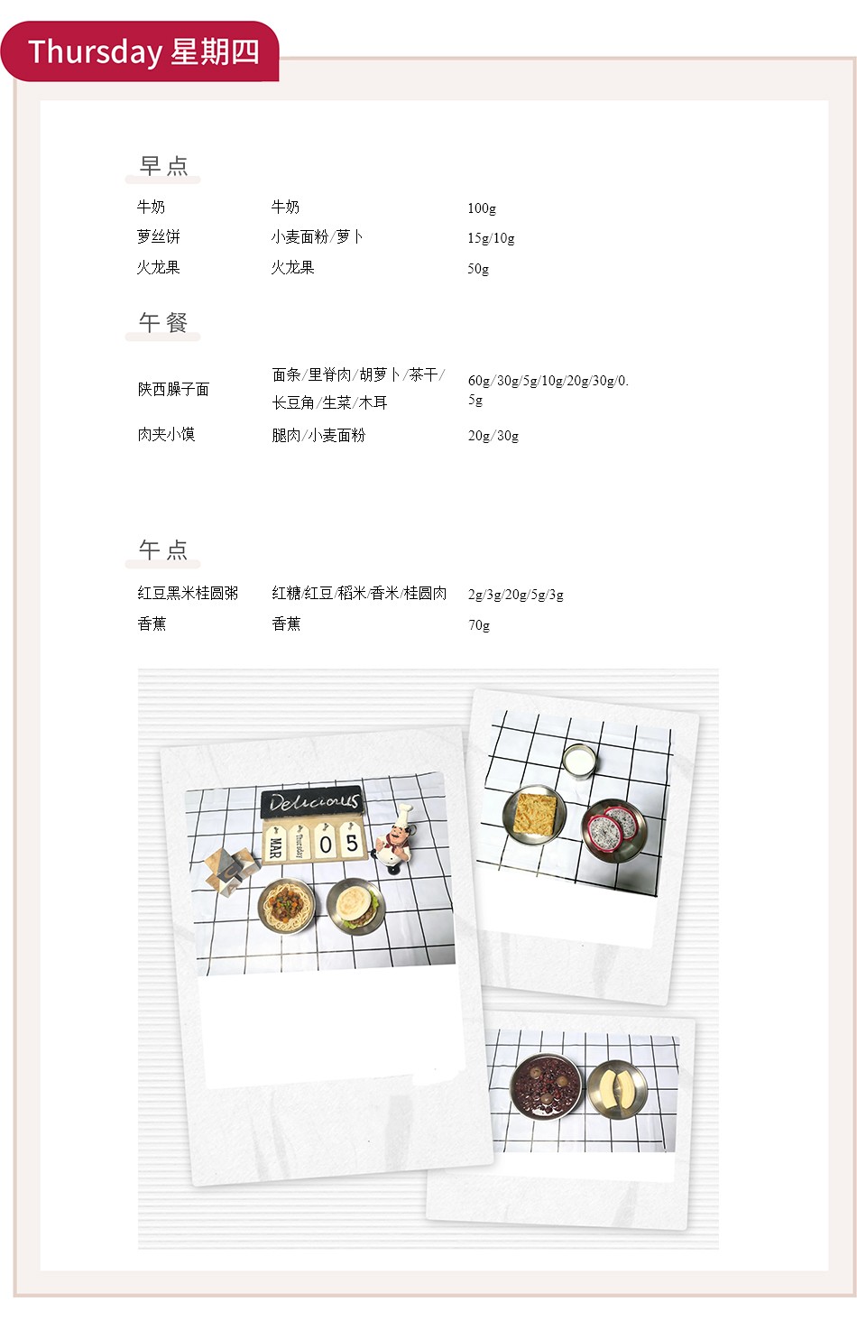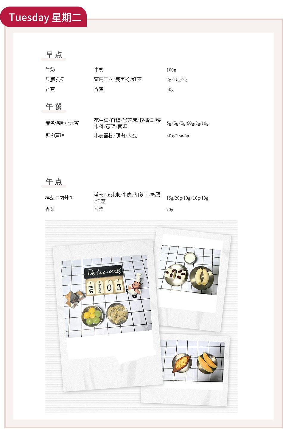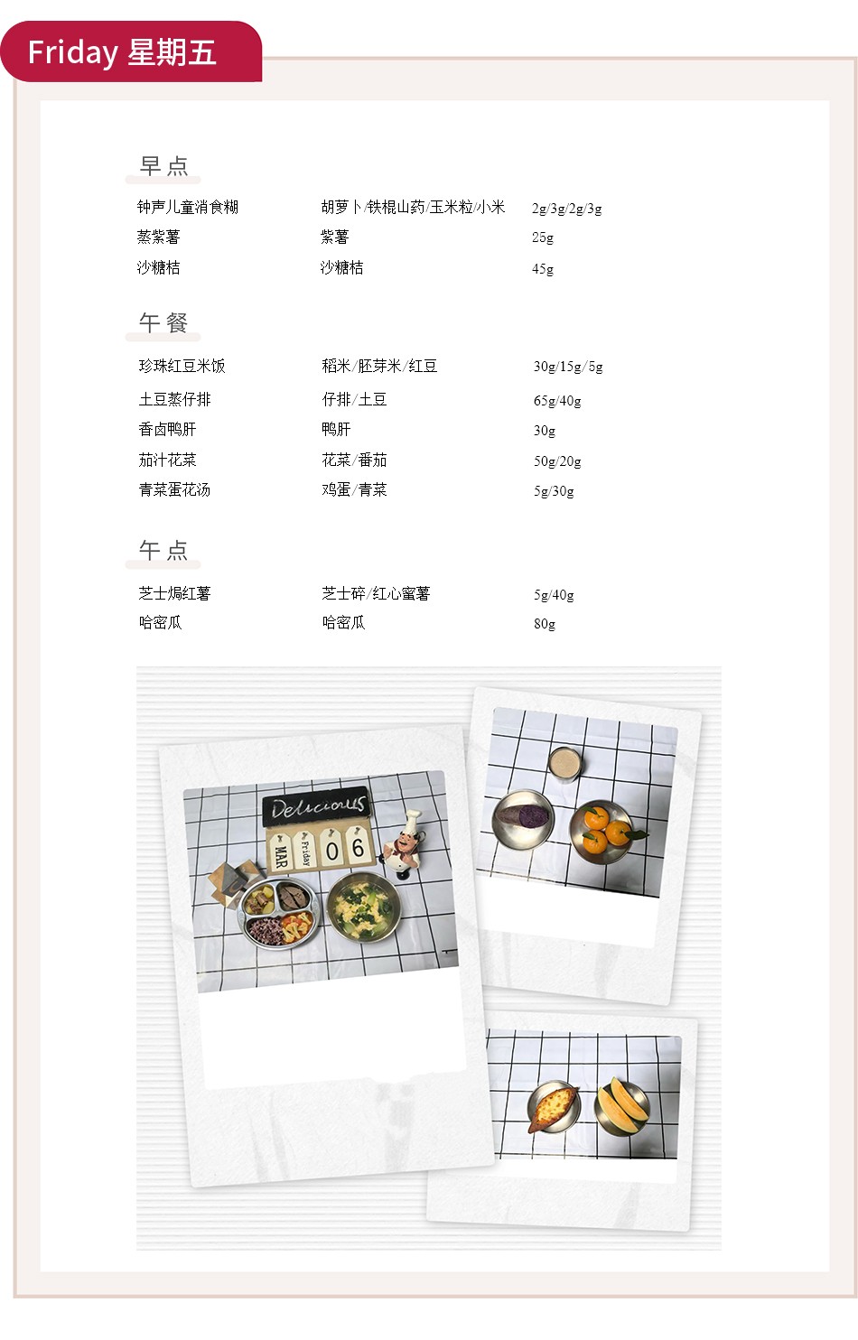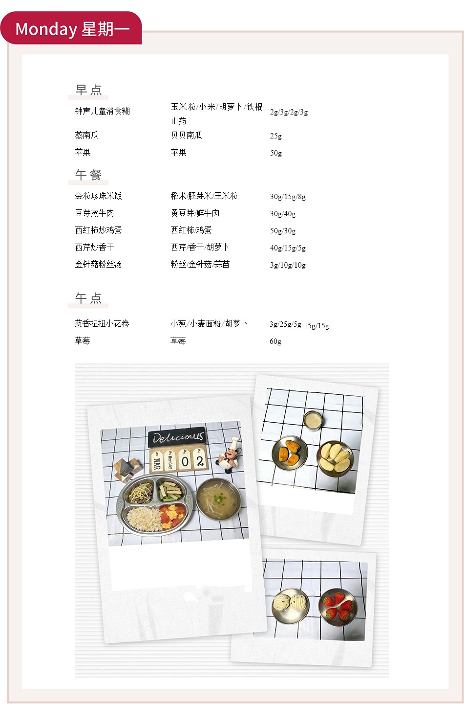 周一至周五的早午餐与午点,涵盖了从主食到汤品的丰富选择。如“豆芽蒸牛肉”“香菇山药蒸鸡块”“土豆蒸仔排”等蒸菜,不仅保留了食材的原汁原味,更通过蒸制工艺锁住营养,符合幼儿清淡饮食的需求。搭配的“金粒珍珠米饭”“红豆黑米桂圆粥”等主食,粗细搭配,均衡膳食。