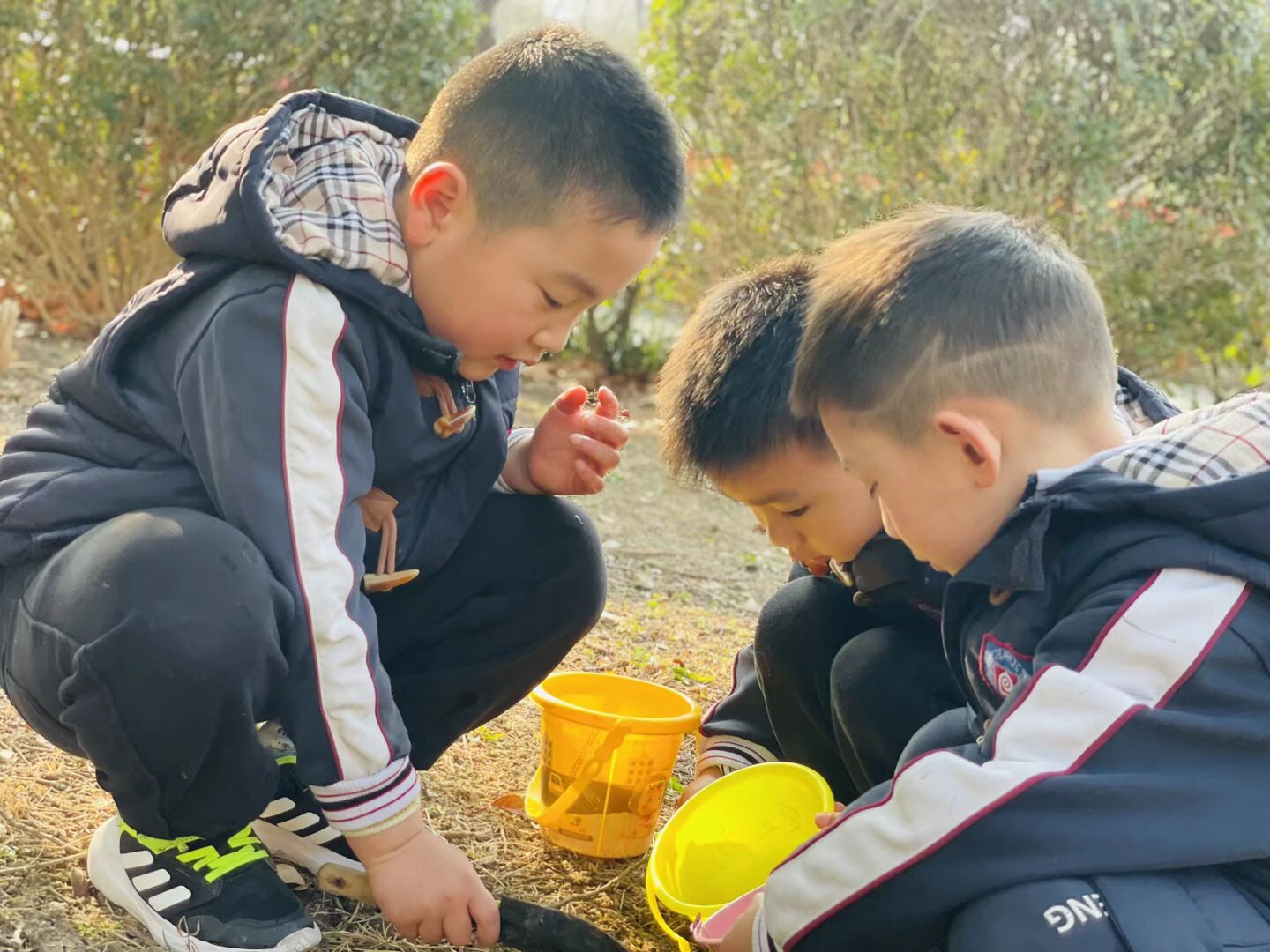实践环节中,孩子们化身“小小护绿员”,热情满满地投入到活动中。大家分工合作,有的小心翼翼地给树木浇水,让干枯的枝干汲取春日甘霖;有的蹲在草丛旁,认真捡拾落叶、杂物,守护身边的绿色家园;还有的三五成群,蹲在地上观察小草发芽、野花绽放,用小容器收集春日的花草,制作专属的自然标本。孩子们专注的小眼神、忙碌的小身影,成为春日里最动人的风景,欢声笑语洒满整个场地。