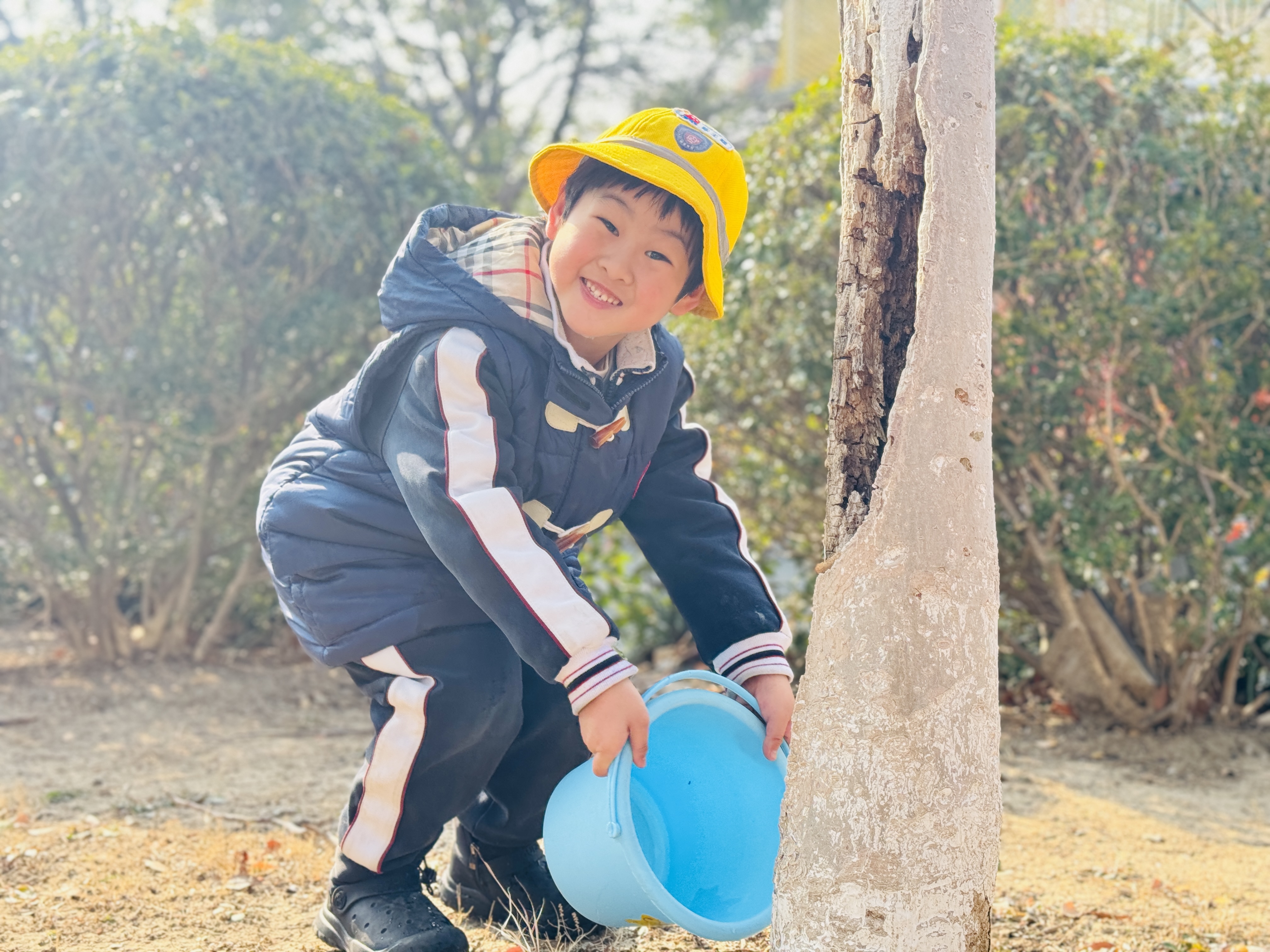 活动当天,阳光明媚,孩子们身着整齐的园服,头戴小黄帽,手持小水桶、小铲子等工具,满怀期待地奔赴户外实践场地。出发前,老师向孩子们讲解了植树节的由来、树木对环境的重要作用,以及浇水、护绿的小知识,让孩子们在趣味讲解中了解自然、敬畏自然。