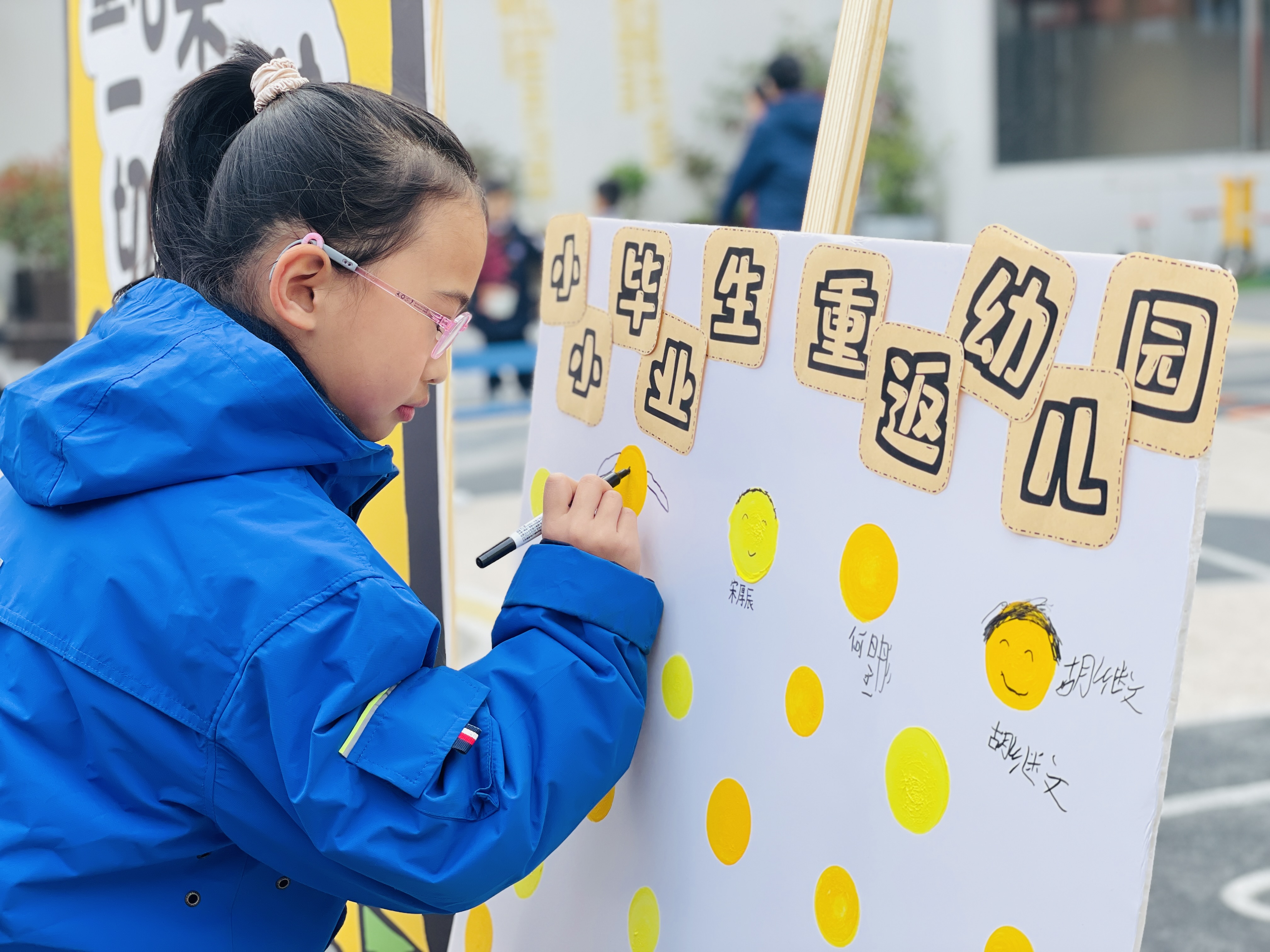 踏入园区,毕业生们在“小毕业生重返幼儿园”签到板前认真留名,一笔一划满是对童年的眷恋。