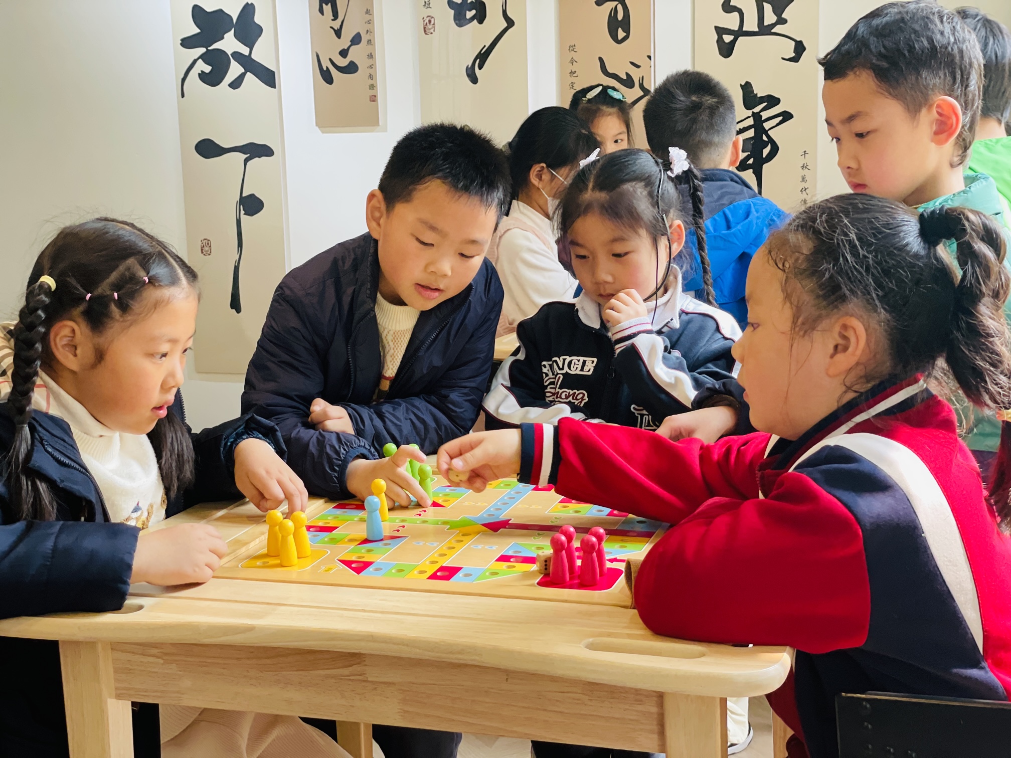 随后,幼儿园的小向导们化身“小小讲解员”,带领哥哥姐姐们深度探索园区:在乐龄食堂,孩子们了解营养膳食与敬老文化;在棋牌室,大小朋友组队博弈,在飞行棋、数字桌游中收获快乐与思维成长;在泥塑室,大家驻足欣赏传统手作,感受非遗文化的魅力。